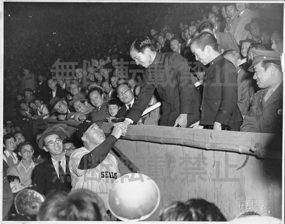 (中央右から1人おいて正仁親王殿下(当時)、明仁皇太子殿下(当時)その左2人おいて、柴田秀利氏、その下、明仁皇太子殿下と握手しているのはレフティ・オドール、サンフランシスコ・シールズ監督)