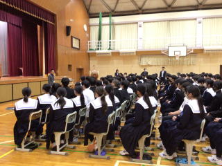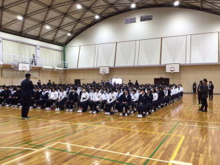 | 12月23日(火)全校集会 本日4時間目、全校生徒が体育館に集まり、全校集会が行われました。3年生の代表生徒がこれまでの学校生活を振り返っての思いとこれからの目標についての発表がありました。 その後、校長先生からは普段の生活を大切にし、当たり前のことを当たり前にすることを徹底する北中生のすばらしさについて話されました。 |