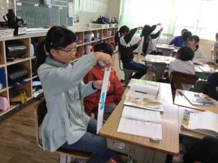 「わたしたちのからだと運動」の学習で、腕の骨と筋肉に見立てた教具で、筋肉が縮んだり、緩んだりすることによって、腕の曲げ伸ばしをしていることを確かめました。 |
