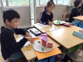 図工で思い思いの世界観を形にして、作品に仕上げました。剣道をモチーフに作った子は、「これは剣道をしているところで、ちゃんと赤白の旗を上げれるようになっているんだよ」、「メリーゴーランドで、真ん中だけ工夫したんだよ」と嬉しそうに話してくれました♪ |