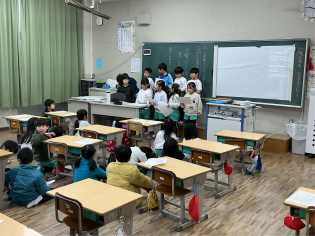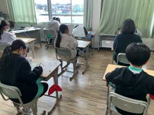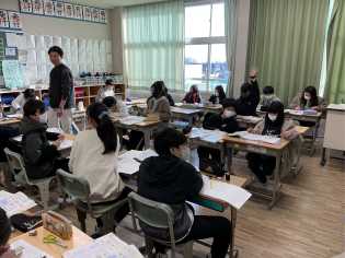朝の歌「冬の歌」を学年で、とても元気に、楽しそうに歌っています。代表の子が、振り返りをみんなの前で発表していました。その後、オーストラリアから体験入学に来ている子が、オーストラリアの生活を写真で紹介しました。すてきな交流ができました。