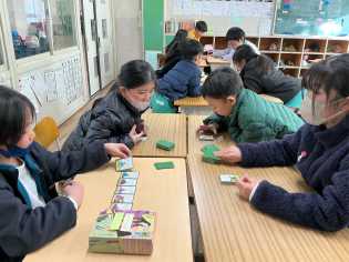 今週は、伝承遊び週間です。1年生は、授業参加でも見ていただいた「こま回し」に挑戦中です。(上左)3年生は、「百人一首」に親しんでいます。まずは、盛り上がる「坊主めくり」に挑戦してます。(上右)4年生は、グループで「百人一首」に取り組みました。地域の方に詠んでいただき、上の句が詠まれるとすぐに「はい!」と言って取る子もいました。(下) |