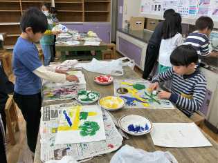 4年生になって初めて使う彫刻刀にも少しずつ慣れてきた様子で、版画になったときの様子を想像しながら、削るときの手の位置に気を付け、慎重に彫り進めました。