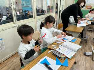 そんな寒さ厳しい一日でしたが、3年生の教室では、算数科の授業で、折り紙を使って二等辺三角形や正方形をつくる学習に夢中になって取り組んでいました。