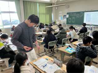 5年生の教室では、算数科の授業で、円柱と角柱の図を書く学習に集中して取り組んでいました。手が止まると自然に教え合う姿が見られました。その様子から、学び合いが定着していることを実感しました。