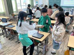 給食の時間には、給食委員が食缶や食器、残菜の片付けを手伝っています。2年生が、ワゴンを上手に運んでいます。その後、コンテナに食缶や食器、残菜の片付けます。こんなに上手になったのは、給食委員のサポートのおかげです。