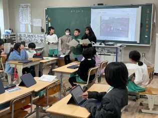 国語科「道具のうつりかわりを説明しよう」の学習では、昔のくらしについて、タブレット端末を使ってまとめ、グループで発表しました。(下) |