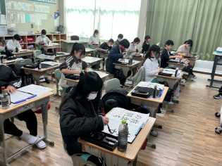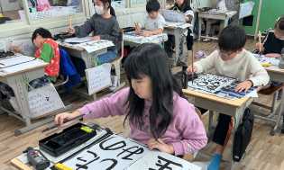 半紙一枚を書いては、手本を見直し、自分で修正しながら次の半紙に取り組んでいます。3年生で初めて始めた習字道具の扱いに慣れてきて、手や作品を汚さずに書けるようになってきました。