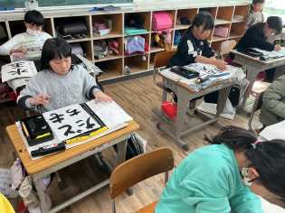 初めて筆を握ってから、はや一年が過ぎようとしています。今日は、「書で遊ぼう」と題して、思い思いの字を書きました。手本がないので、失敗はないはずなのですが、「失敗しちゃった・・・」と落ち込む子もいましたが、それぞれの個性あふれる作品が出来上がりました。 |