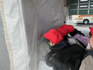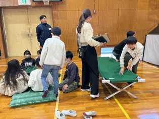 思ったよりも寝心地のよい簡易ベッドに寝転んだり、非常食に触れたりしながら、いざというときに安心して過ごすための知識を学びました。 |