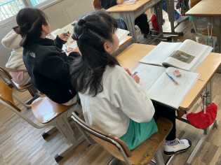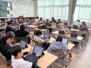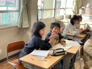 2026年の初日ですが、普段の学校の景色が戻ってきました。写真は、1・2年生の書写、1年生の生活、5年生の国語、6年生の社会です。