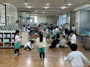 体育科の学習では、8の字跳びに取り組んでいます。みんなで声をかけ、数えています。大繩の中に入るのを怖がっている子には、「今、今」とタイミングを教えたり、「がんばれ!」と声をかけたり、一体感があります。