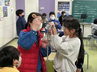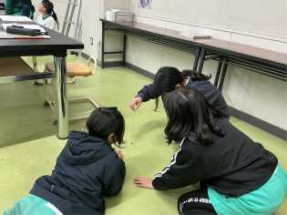 理科の学習では、空気の温まり方を学習する単元で、床と天井近くの温度を温度計で計測しました。脚立に登るときに、「高所恐怖症なんだけど・・・」と言いながらも仲間のためにがんばって高いところの温度を計測している子もいました。 |