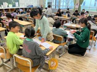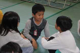 広い運動場に歓声が上がっていました。遊具を使って思いっきり遊びました。その後、1年生の授業の様子を見学しました。国語科の学習をしていた1年生たちの背筋が、ぴんと伸びました。ペアで話し合っている1年生に、興味をもち、のぞき込んでいました。