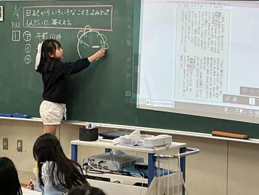 文書から読み取ったことをもとに答える学習をしていました。時計の図に花弁のように書き込みながら公園にいた時間を答えていました。 |
