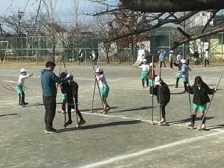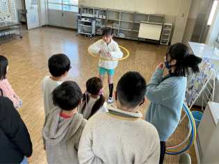 体育科「昔運動に親しもう」の学習では、竹馬、一輪車、フラフープ、なわとびなどに取り組みました。一輪車の子は、鉄棒やバックネットにしがみつきながらバランスをとりながら、一輪車を乗りこなそうとがんばっていました。竹馬に、どうやって乗ったら立てるのか、歩けるのかを四苦八苦しながら取り組んでいました。