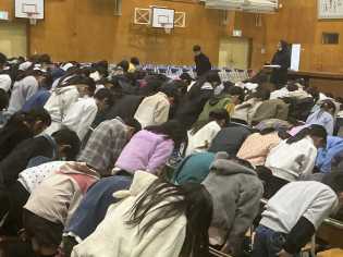 今週から3月となり、卒業式に向けて、ホールで練習し始めました。体育館の卒業生席の並びで座り、昨年度の卒業式の動画を見ながら、動きを確認しました。実際に動いてみることから練習が始まりました。