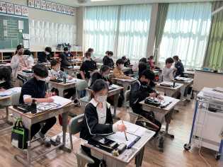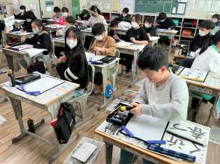 今日が書写の授業の最終日でした。「書を楽しもう」ということで、いつもは無言で準備から片付けまで行っていますが、級友とわいわい言いながら楽しんでいました。それぞれの個性が光る作品が出来上がりました♪