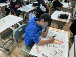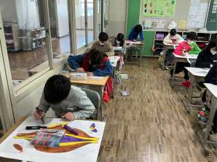 野外学習の絵を描く子もいれば、好きなキャラクターを描く子もいて、個性あふれる作品に仕上がっていきました。