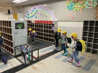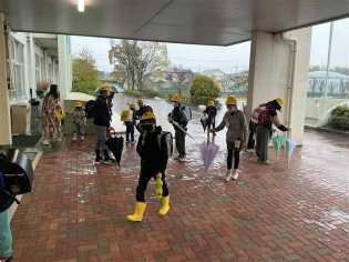 今日はあいにくの天候でしたが、登校した1年生に傘のしまい方を優しく教えている6年生の姿が多く見られました。