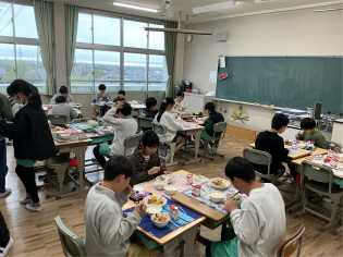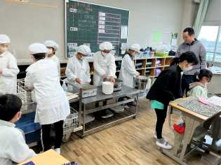 小学校で初めの給食です。給食当番になった子は、これくらいかなと、量を気にしながら、配膳しました。みんなで食べる給食はおいしいね。