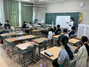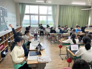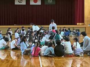 朝の会の時間を使って学年集会を行っていました。あえて座る場所を指定せず、子どもたち同士の関わり合いを生み出す形の集会でした。子どもたちは、隣の子に「あいさつ+ひと言」を言う場面では、恥ずかしがりながらも笑顔で活動していました♪ |