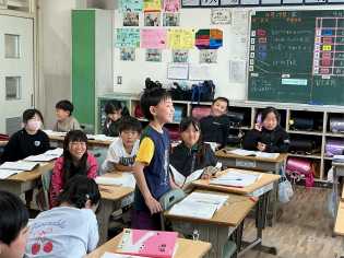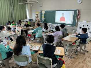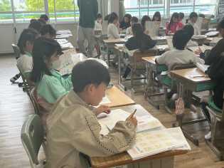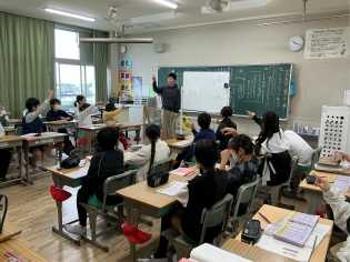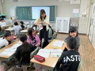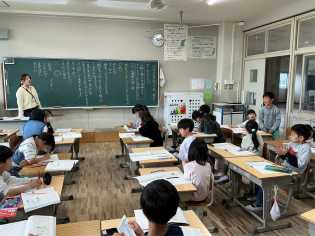 1年生の外国語活動の時間には、1から10までの英語の歌に合わせて踊ったり、3・4年生の国語科では、登場人物のようすが分かる言葉を探したり、登場人物になりきって動作付きで音読したり、子どもたちの意見をもとに内容の理解を深めていました。5年生の外国語科では、自分の名前をアルファベットで書いて、ローマ字との違いに驚いていました。6年生の国語科では、新出漢字の書き順を宙に書いて覚えていました。どの教室でも、笑顔がたくさん見られ、子どもたちも先生も、生き生きしていました♪ |