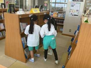 さっそく1年生が、図書室の使い方を学びました。どんな本があるのかと、興味津々、図書室を探検しました。一人1冊選んで、学級文庫の本を借りました。