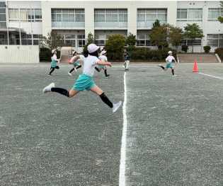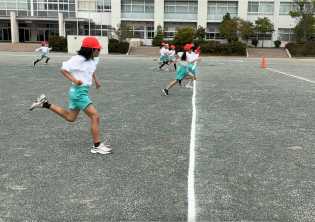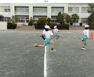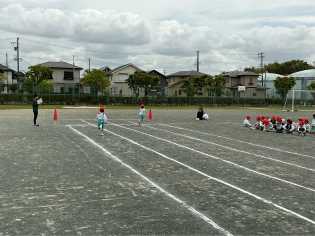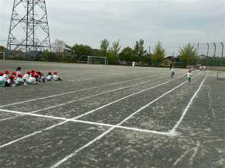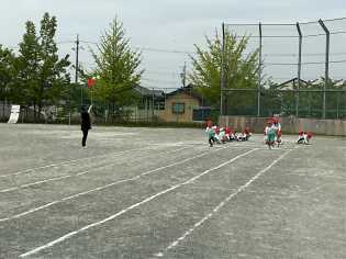 「いちについて、よ~い、ドン」の合図で力いっぱい走りだすと、待機している子どもたちや走り終わった子どもたちから、「がんばれ~!」の声が響いていました。中には、途中で止まりそうになった子もいましたが、声援を背にゴールまで全員が走り切ることができました。運動会が楽しみです♪ |