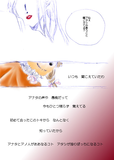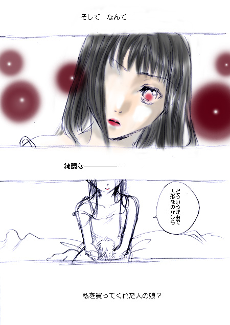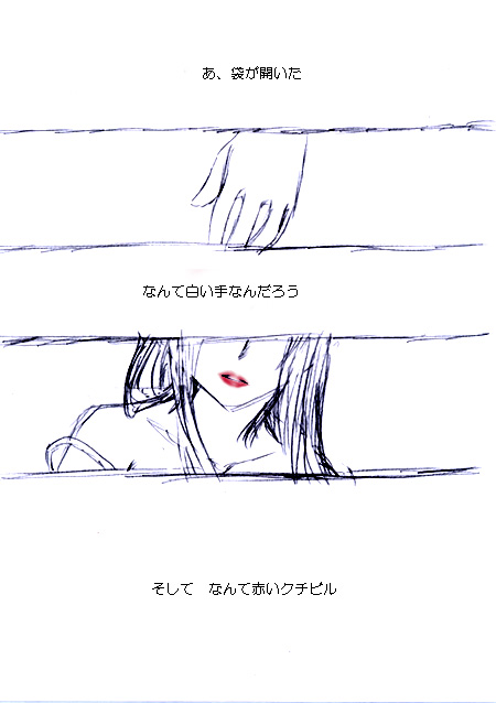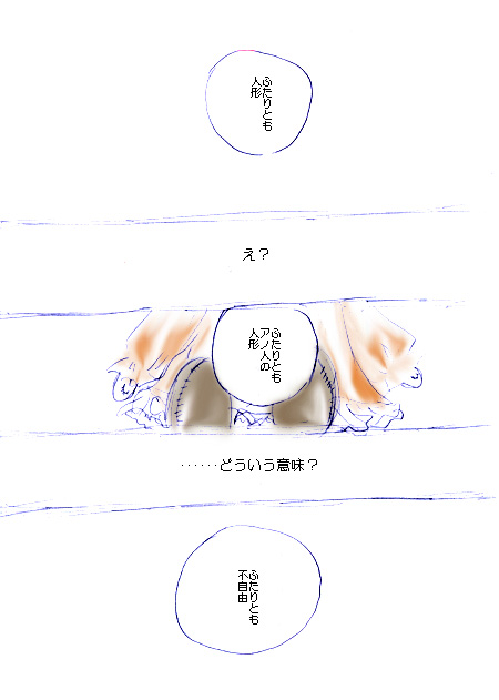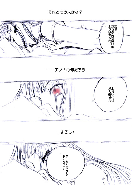 鉛筆一発描き。 なんか自分で描きながら 「・・・?この構図どっかで見たような・・・」 って思う絵がひとつ。 ところどころ女の子の顔が変わっちゃっています(汗) ていうか訳わかんねぇよ この漫画 ていうか漫画なのかよ
