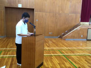 長い夏休みが終わりました。1時間目は全校集会。力強い北中太鼓の演奏に始まり、夏休みまでの表彰伝達がありました。 その後、校長先生より全校へ向けてのお話がありました。夏休み中に大きな事件や事故がなかったことをとても嬉しいと話されました。 続いて、生徒会役員より9月からの活動についての話がありました。生徒は皆、背筋を伸ばし、話し手に集中して聴こうとする姿が見られました。