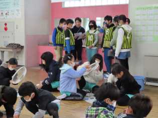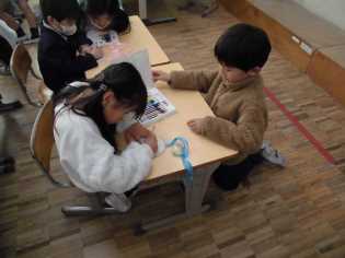 体育委員会では、2月6日(火)~8日(木)の3日間、大なわとび練習会を実施しました。各学級にお知らせに行ったり、放送で呼びかけたりしました。集まった子を3つのチームに分け、8の字跳びの練習をしました。上学年が、下学年に優しく教えたり、「上手!」と声をかけたりしながら、なかよく練習しました。(右) |