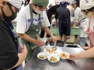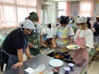 野菜の彩りを生かして、野菜炒めを作りました。おいしそうな香りが校舎の中に立ち込めました。 |