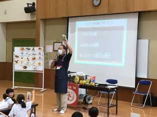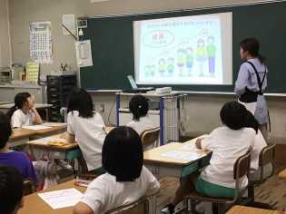 食育の一環として、(株)明治の方を講師としてお招きし、「丈夫な体づくり」について学びました。牛乳やヨーグルト、オレンジジュウスなどに含まれるカルシウムの量を聴き、「ええ!」「そうなんだ」と新しい発見をしていました。どんな朝ごはんがよいのかを考える活動もありました。朝ごはんと栄養バランスの大切さを知り、望ましい食習慣を身に付けるために、子どもたちに分かりやすく説明していました。参観されたお家の方も、うなずいていました。 |