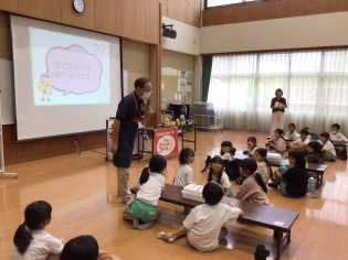 子どもたちを交通事故から守るためにダンプカー協会の方と警察官の方を講師としてお迎えして交通安全教室を開催しました。