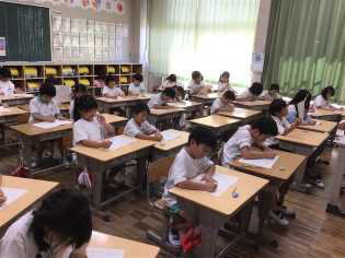 前期も終わりに近づき、これまで一緒に掃除してきた仲間と振り返りを行い、ありがとうの手紙を書きました。下級生の横に自然に座って、手紙を書いている様子から、この半年間のなかよしそうじの成果を感じました。 |