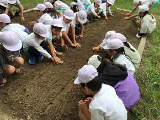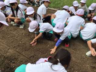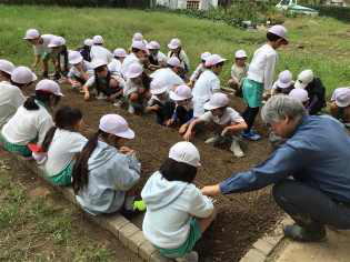 今日は、畑に大根の種をまきました。「手の三つ分をとって、そこに穴を空けて、種を植えるんだよ」という説明をしっかり聴いて、丁寧に種を植えていました。りっぱな大根に育ちますように。