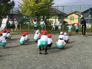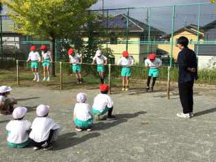 曇り空の下、元気いっぱいに鉄棒に取り組んでいました。担任の笛の合図に合わせて、ジャンプしておへその辺りを鉄棒に近づける運動をしていて、微笑ましかったです。