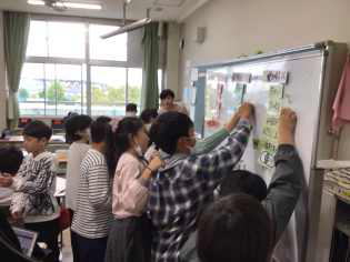 今日は、6年生でも研究授業を行いました。総合的な学習の時間では、「みんなが安全に避難するために自分たちにできることはなんだろう」というめあてで、避難訓練の振り返りから、何が足りなかったのかを話し合いました。避難訓練では、「危機感がなかった」「意識が低かった」「自分自身のことしか考えていなかった」などの意見にまとまり、一人一人が具体的なアイデアを付箋に書き込んでいました。 |