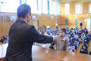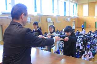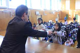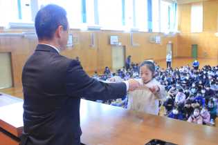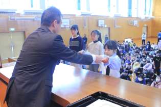 その後に、表彰伝達を行いました。書道やポスターなど、それぞれの得意分野で輝いた子どもたちは、表彰状を受け取る姿も大変凛々しかったです。個々のがんばりに拍手を送りました。
