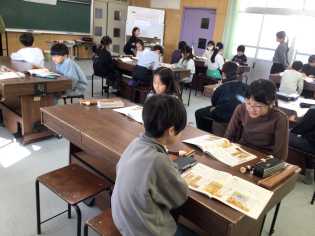 5年生の授業では、「詩と音楽の関係をみつけよう」というめあてで、詩を読んだあとに、音楽を聴いて工夫しているところを見つけようとがんばっていました。 |