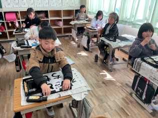 半紙一枚を書いては、手本を見直し、自分で修正しながら次の半紙に取り組んでいます。3年生で初めて始めた習字道具の扱いに慣れてきて、手や作品を汚さずに書けるようになってきました。