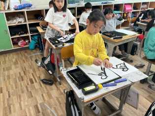 初めて筆を握ってから、はや一年が過ぎようとしています。今日は、「書で遊ぼう」と題して、思い思いの字を書きました。手本がないので、失敗はないはずなのですが、「失敗しちゃった・・・」と落ち込む子もいましたが、それぞれの個性あふれる作品が出来上がりました。 |
