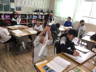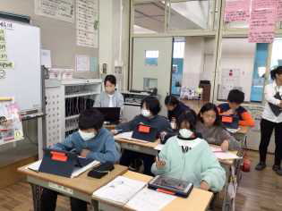 家庭科では、「調理実習ではどのお米を使いたいですか」とさまざまな情報を基に考える授業を行いました。タブレットを準備するときも片付けるときも静かに動いたり、発言する友達の方に顔を向けて一生懸命に聞いたり、当たり前のことかもしれませんが、学級のよさをたくさん発揮していました。米を選ぶ基準も、それぞれの思いがあり、大変興味深い授業でした。