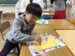 図工で思い思いの世界観を形にして、作品に仕上げました。剣道をモチーフに作った子は、「これは剣道をしているところで、ちゃんと赤白の旗を上げれるようになっているんだよ」、「メリーゴーランドで、真ん中だけ工夫したんだよ」と嬉しそうに話してくれました♪ |