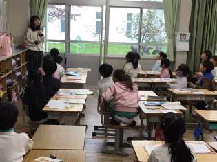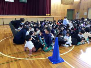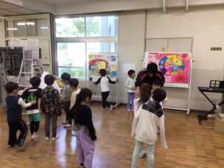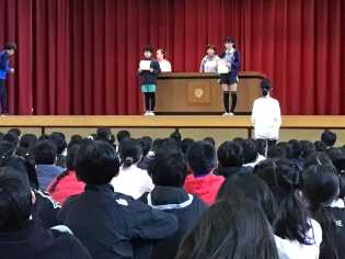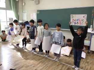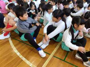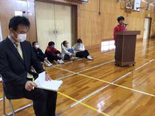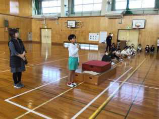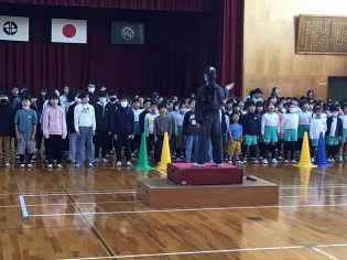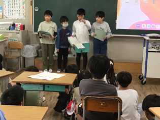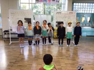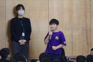 練習の最後には、定番の振り返りをしました。ペアで行った後、各学年の代表者が振り返りを述べました。全校の前でも自分から手を挙げ、りっぱに話す姿はすてきでした🎵 |