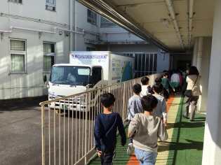 燃料電池(FC)で走り、環境に優しい「給食配送用FCトラック」が本校にやってきました。愛知県内で初めて導入されたのがみよし市で、そのトラックを本校の3年生が迎えました。トラックが入ってくると子どもたちは大きな拍手で出迎えました♪
