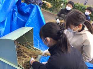 地域のデイケアに通っていらっしゃる方々から心のこもった手縫いの雑巾を寄付していただいたり、5年生の稲の脱穀では、貴重な人力脱穀機を貸していただき、5年生の2クラスが脱穀をした後も残ってくださり、お昼までに全ての稲の脱穀をしていただいたり、交流する機会がたくさんあった1日でした。地域の方々との温かいつながりを感じることができ、心がほっこりし、温まりました。