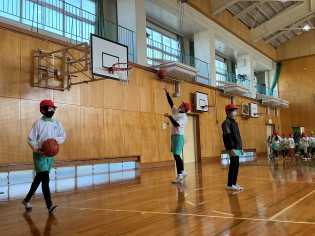 体育科「バスケットボール」の学習では、シュート練習に取り組みました。ドリブル→パス→パス→シュートの流れで、何回も練習しました。(上左)