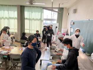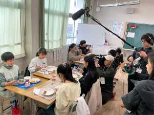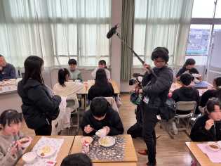 今日は、給食の無償化についての取材ということで、中京テレビが取材にみえました。子どもたちが配膳するところから、美味しそうに会食する様子を撮影していきました。